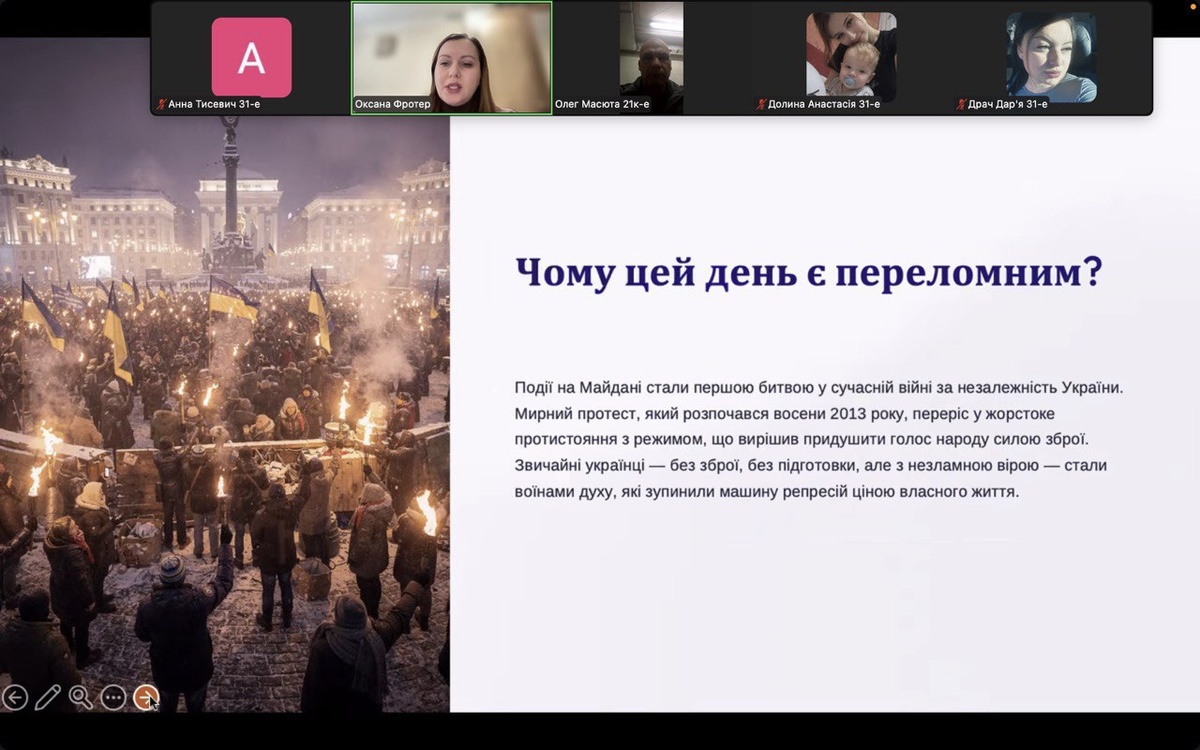 Доцент кафедри економіки, куратор 31-е і 21к-е груп Оксана Фротер нагадала студентам про події Революції Гідності, розкрила її історичне та суспільне значення, зупинилася на подвизі Небесної Сотні та впливі цих подій на подальшу боротьбу України за свободу і незалежність.