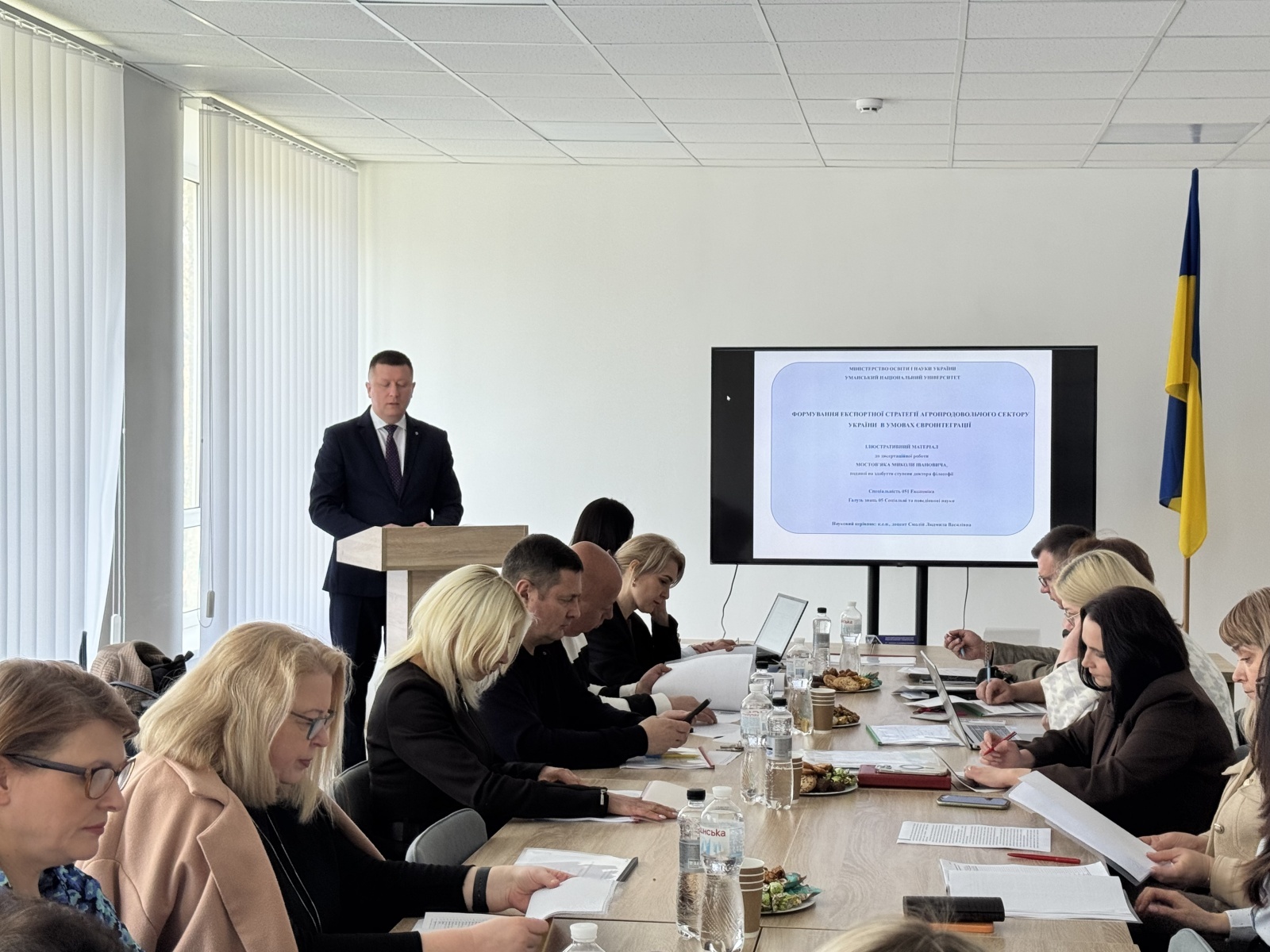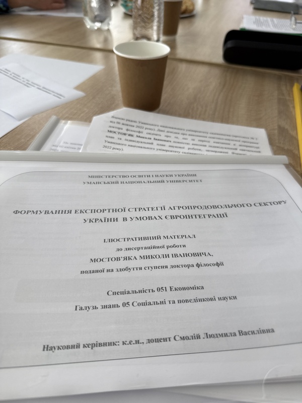 Дисертант представив результати дослідження на тему: «Формування експортної стратегії агропродовольчого сектору України в умовах євроінтеграції», що виконане за спеціальністю 051 Економіка під науковим керівництвом к.е.н., доцента кафедри економіки Людмили Василівни СМОЛІЙ.