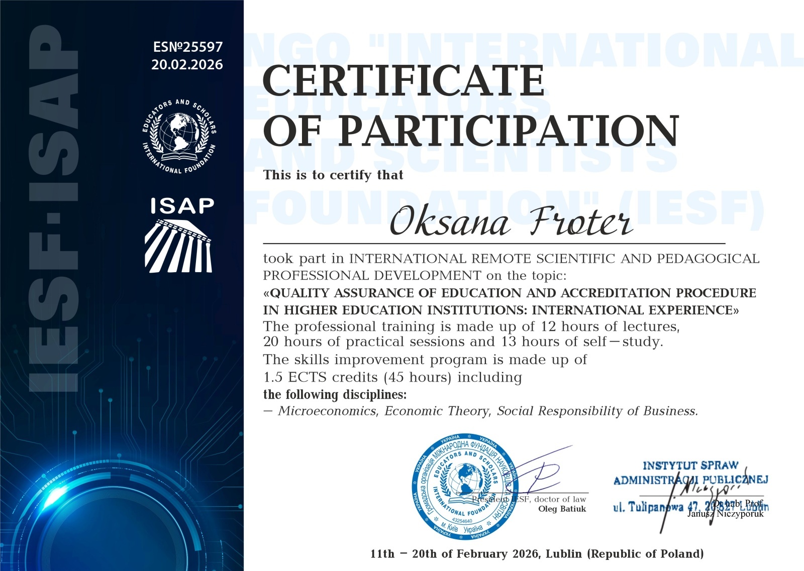 Стажування проходило з 11 по 20 лютого 2026 року. Організаторами заходу виступили: Інститут справ адміністрації публічної (м. Люблін, Республіка Польща) та Громадська організація «Міжнародна фундація науковців та освітян» (IESF).