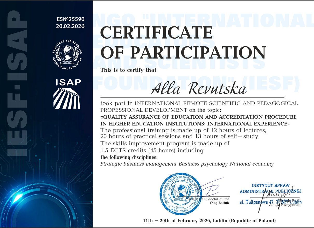 Доцент кафедри економіки Алла РЕВУЦЬКА успішно завершила міжнародне науково-педагогічне підвищення кваліфікації у онлайн форматі на тему: «Забезпечення якості освіти та процедура акредитації у закладах вищої освіти: міжнародний досвід».