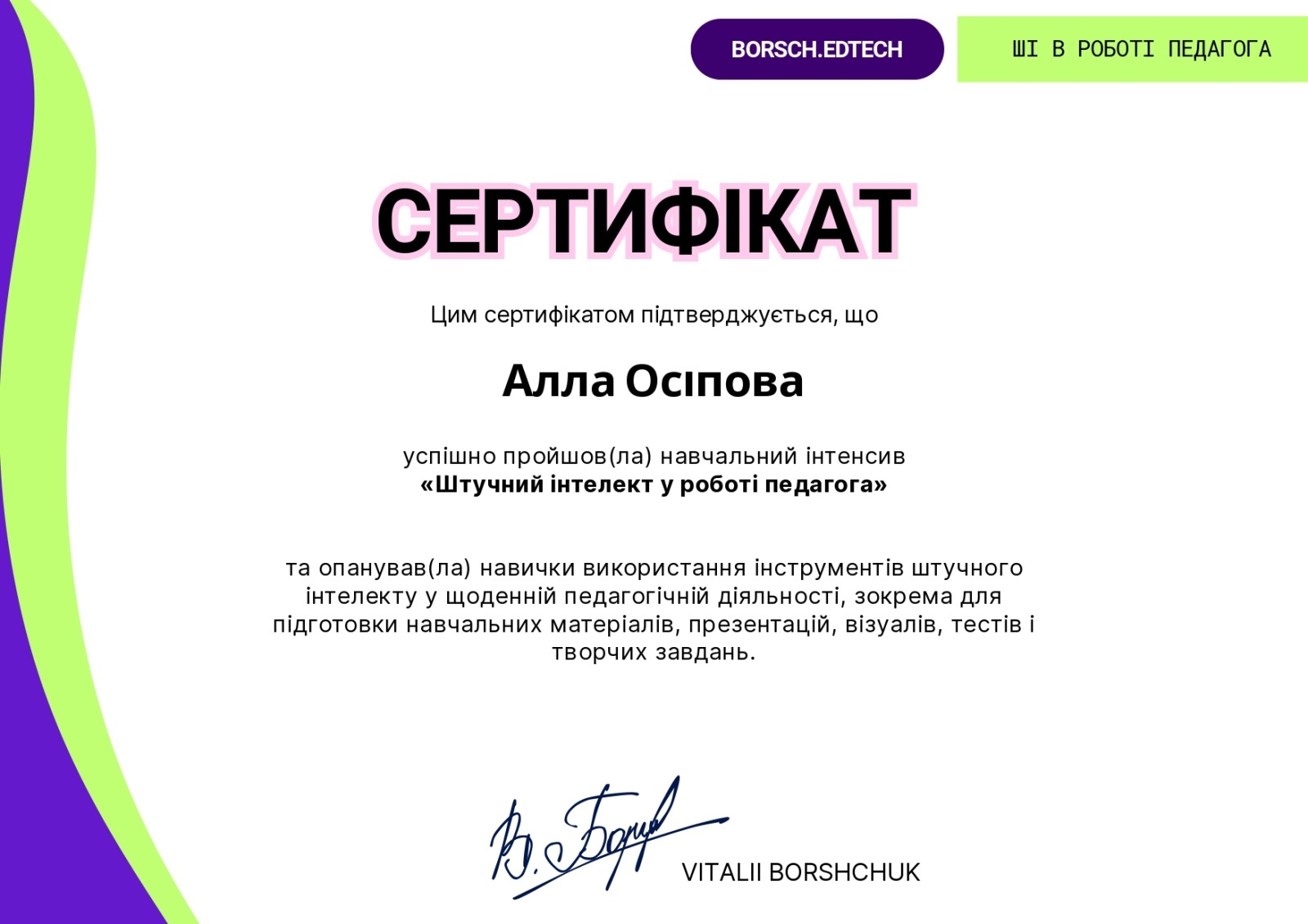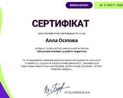 Також було успішно завершено навчальний інтенсив «Штучний інтелект у роботі педагога», спрямований на формування практичних навичок використання інструментів ШІ для підготовки навчальних матеріалів, презентацій, тестів, візуалів і творчих завдань.