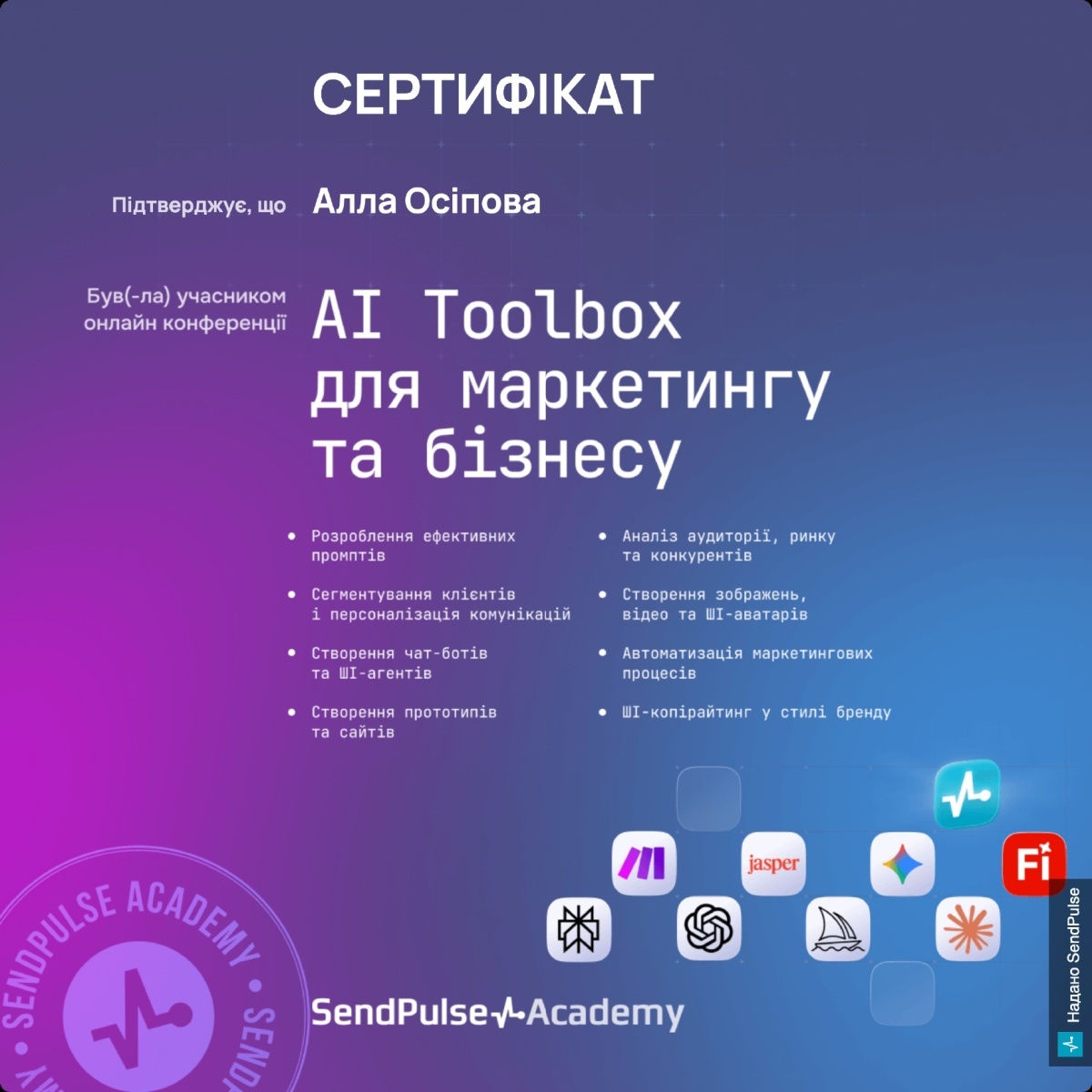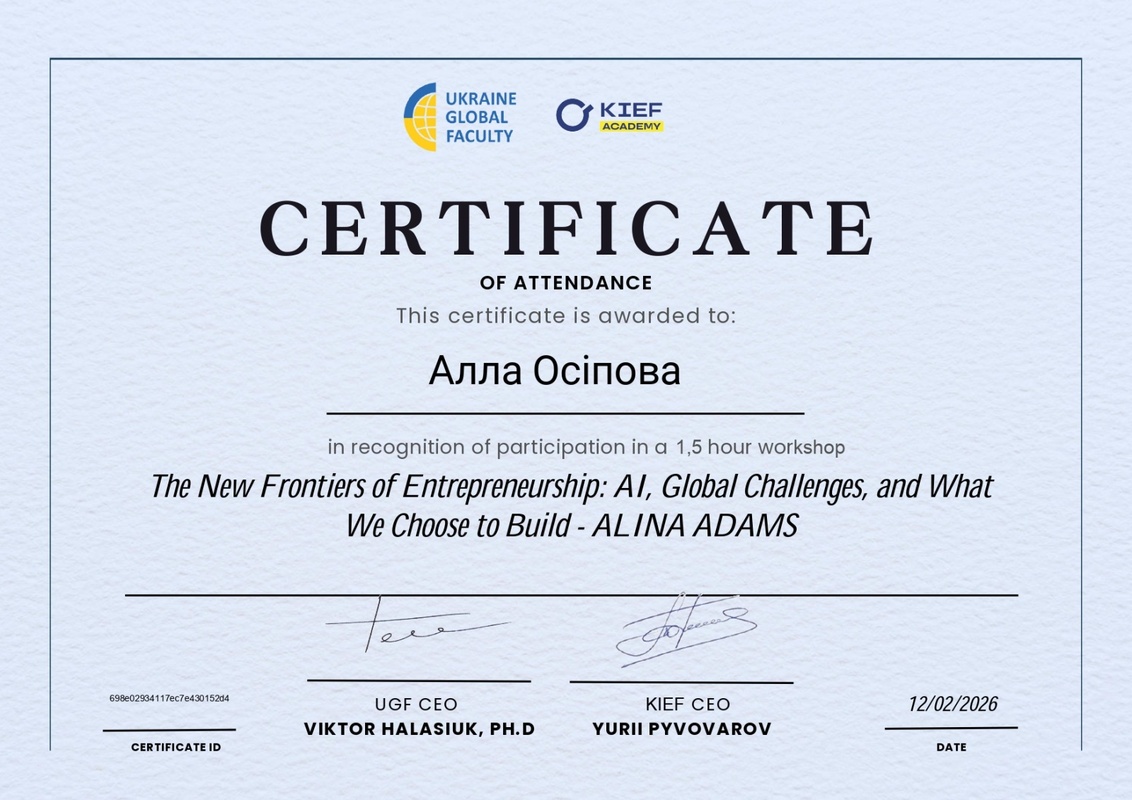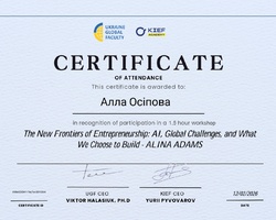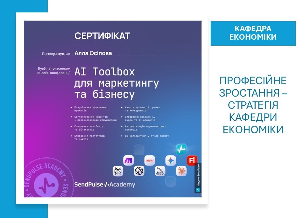 Протягом зимового періоду завідувач кафедри економіки, доцент Алла ОСІПОВА взяла участь у низці навчальних заходів, присвячених актуальним аспектам використання штучного інтелекту в бізнесі та освіті. Зокрема, вона долучилася до онлайн-конференції «AI Toolbox для маркетингу та бізнесу», організованої SendPulse Academy. У межах заходу було розглянуто питання розроблення ефективних промптів, автоматизації маркетингових процесів, створення ШІ-агентів і чат-ботів, а також аналізу аудиторій і ринку.