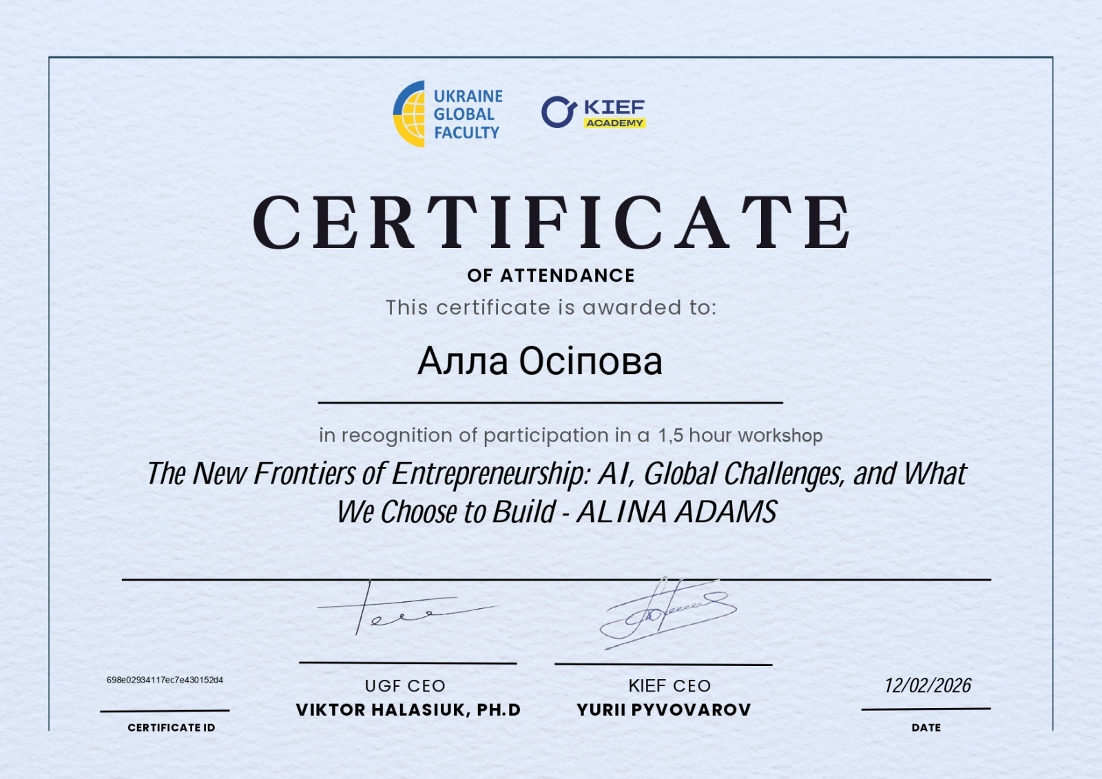 Крім того, Алла Анастасіївна взяла участь у міжнародному воркшопі «The New Frontiers of Entrepreneurship: AI, Global Challenges, and What We Choose to Build». Під час заходу обговорювалися сучасні виклики підприємництва в умовах глобальних трансформацій і роль штучного інтелекту у формуванні нових бізнес-моделей.