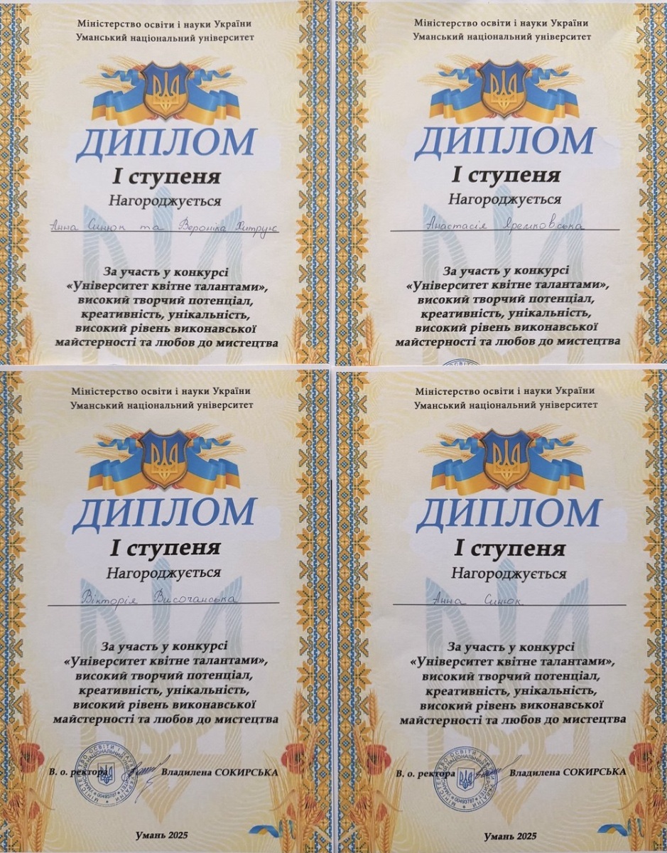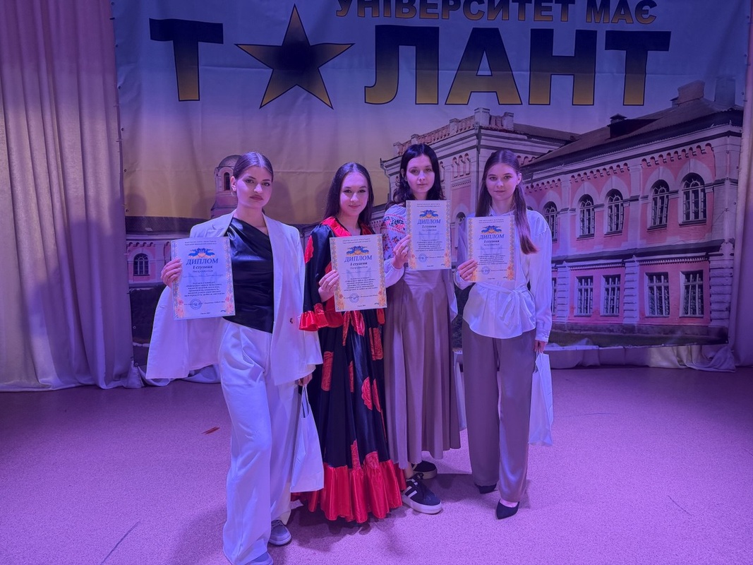 За підсумками конкурсу Дипломом І ступеня у номінації «Університет квітне талантами» нагороджено дует Анни СИНЮК та Вероніки ХИТРУК, а також Анастасію ЯРЕМКОВСЬКУ і Вікторію ВИСОЧАНСЬКУ.