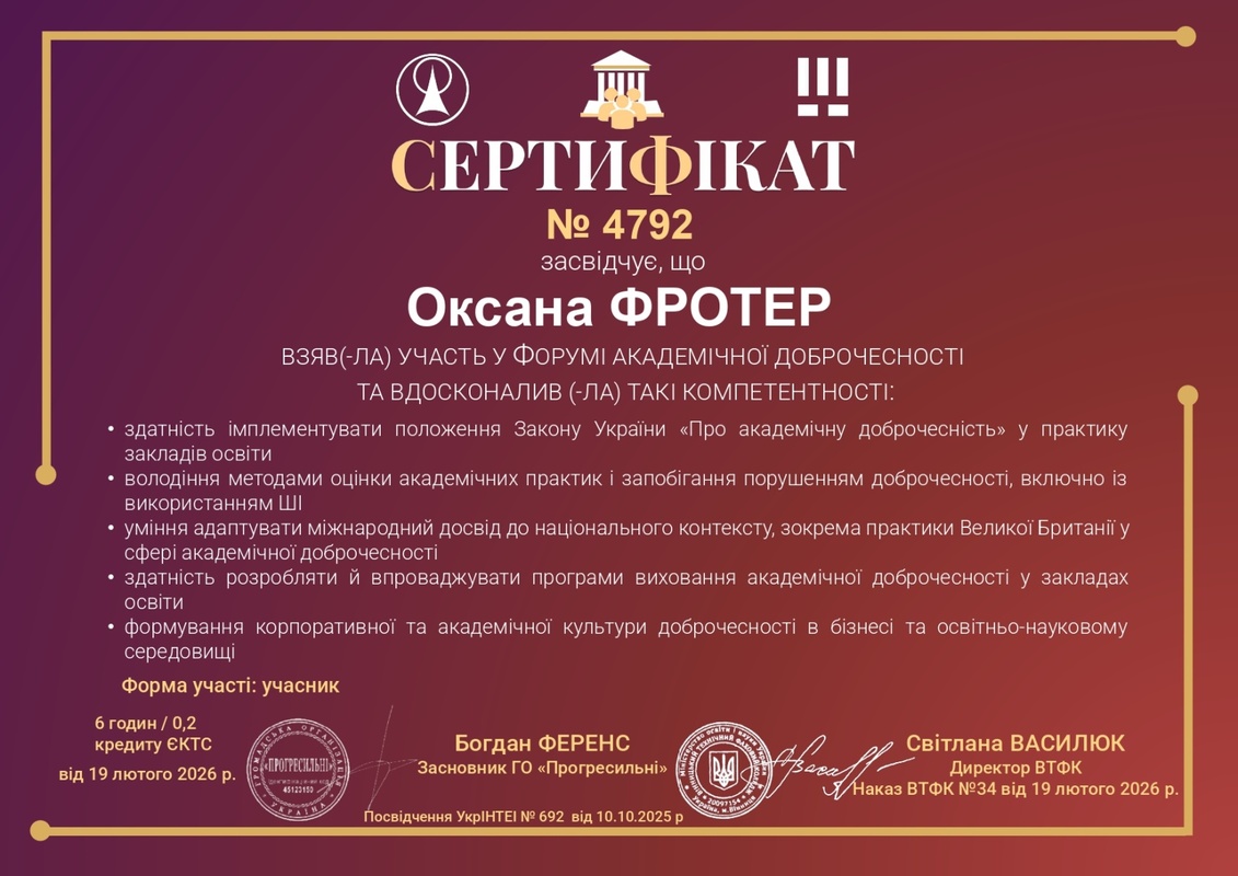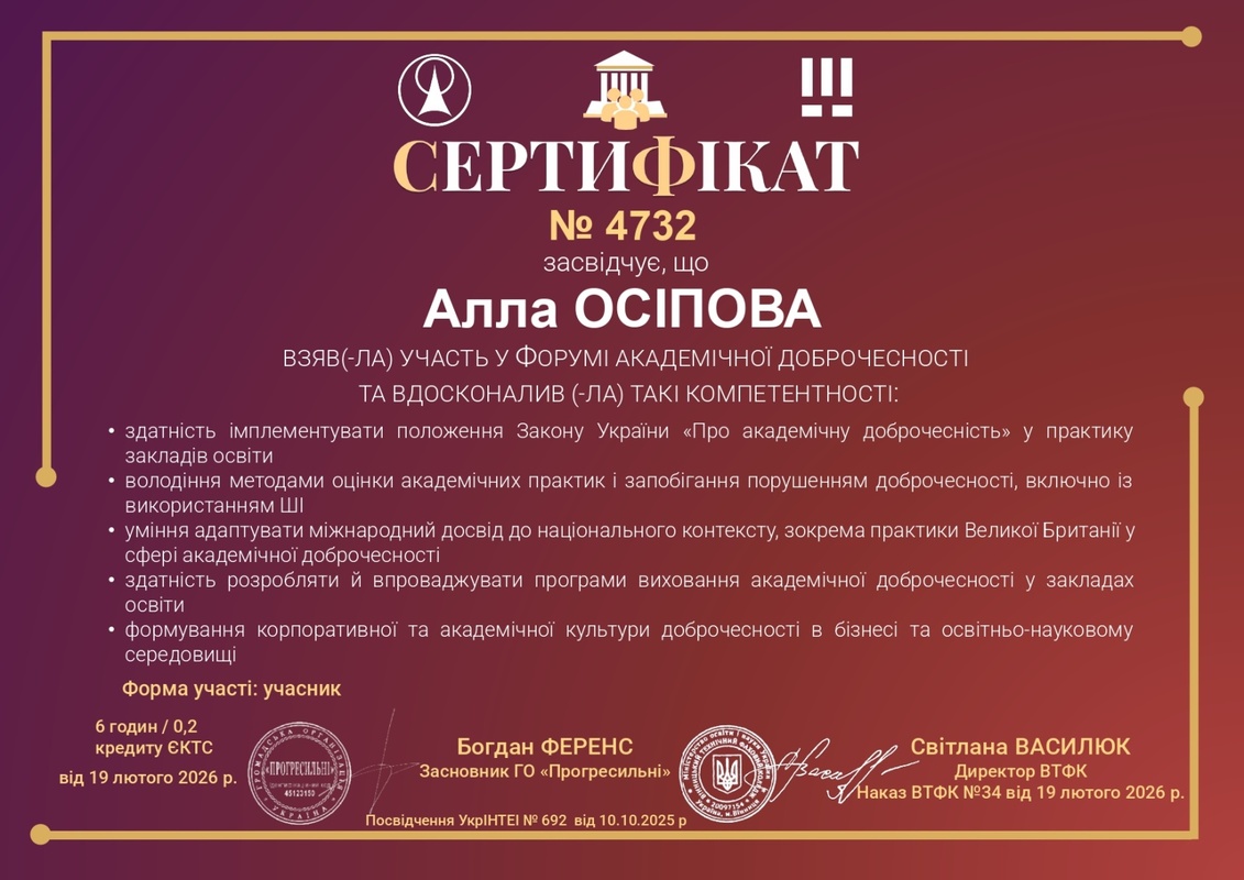 Участь у заході сприяла поглибленню знань щодо практичного впровадження норм законодавства з академічної доброчесності, опануванню сучасних підходів до оцінювання академічних практик і відповідального використання цифрових технологій та штучного інтелекту. За підсумками роботи Форуму учасники отримали сертифікати обсягом 6 годин (0,2 кредиту ЄКТС).