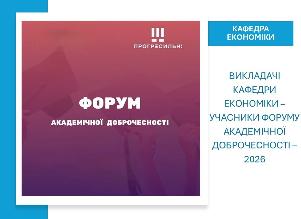 19 лютого 2026 року викладачі кафедри економіки взяли участь у Форумі академічної доброчесності – 2026 «Визначення ефективних підходів для забезпечення академічної доброчесності в освітній діяльності за сучасних умов», що відбувся на базі Вінницького технічного фахового коледжу спільно з ГО «Прогресильні». Захід проходив у змішаному форматі та об’єднав освітян, науковців, управлінців, експертів із питань забезпечення якості освіти та представників бізнесу.