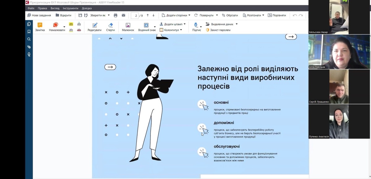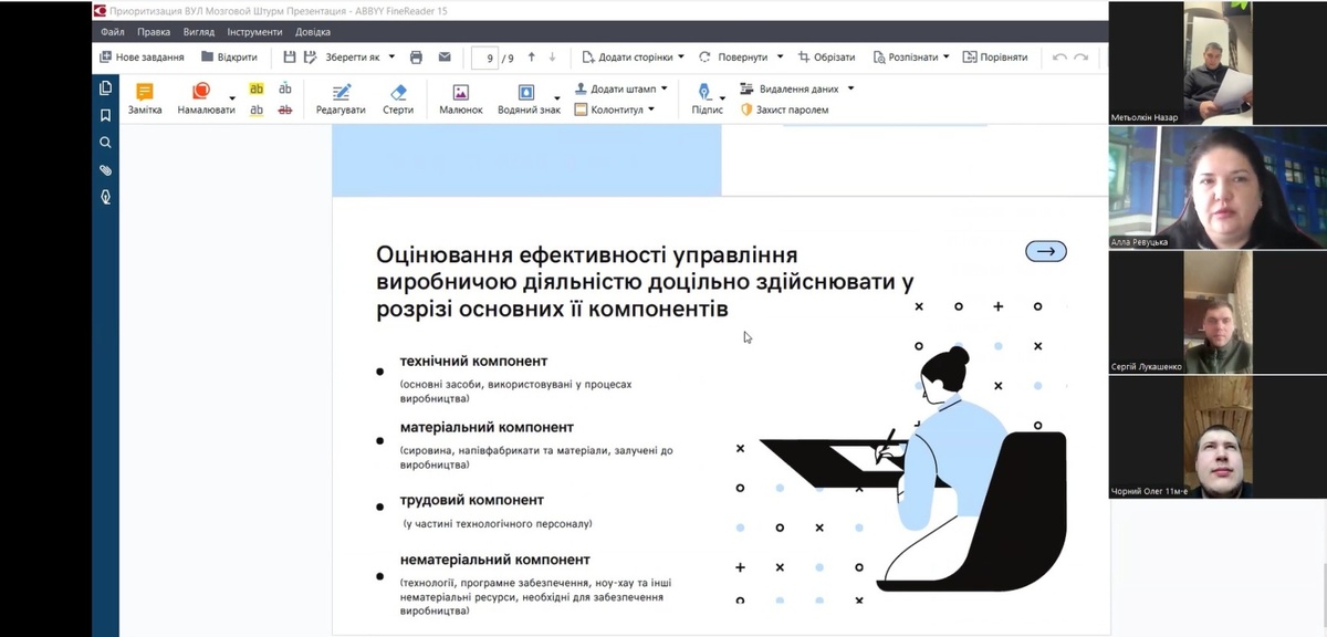 Особливу зацікавленість викликало питання оцінки ефективності. Магістри дізналися, як на практиці виявляти «вузькі місця» та розробляти заходи для подолання негативних явищ у роботі бізнесу. Було детально розібрано компоненти оцінювання: від технічного стану основних засобів до нематеріальних активів, таких як ноу-хау та програмне забезпечення.