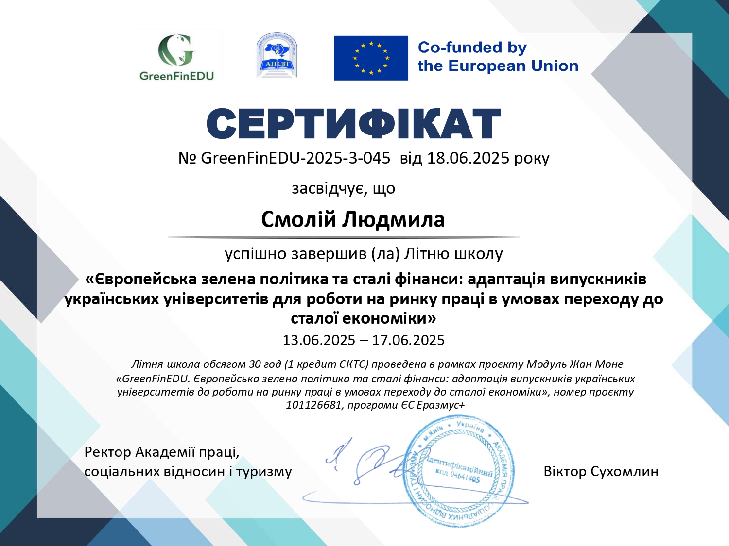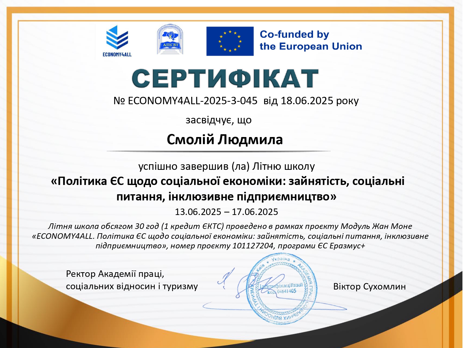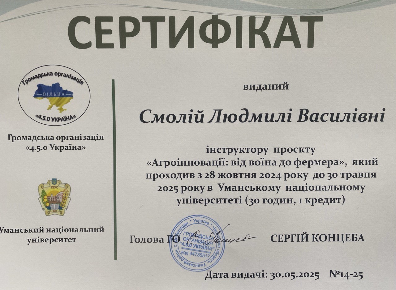 1. Міжнародне підвищення кваліфікації наукових, науково-педагогічних працівників та працівників закладів освіти «Трансфер освітніх технологій в країнах Європейського Союзу та Україні» (Польща) (24.07.2023 –31.07.2023). Сертифікат ES№ 15052 від 31.07.2023 2. Міжнародне підвищення кваліфікації наукових, науково-педагогічних працівників ЗВО на тему: «Академічна доброчесність при підготовці магістрів та здобувачів доктора філософії (PhD) в країнах Європейського Союзу та Україні», (Польща) (11.09.2023 – 18.09.2023). Сертифікат ES№ 15609 від 18.09.2023 3. Міжнародне підвищення кваліфікації наукових, науково-педагогічних працівників та працівників закладів освіти «Трансфер освітніх технологій в країнах Європейського Союзу та Україні». ГО «Міжнародна фундація науковців та освітян» (24.07.2023 - 31.07.2023). Сертифікат ES№ 15609 від 18.09.2023 4. Міжнародне стажування для науково-педагогічних працівників "Дистанційна освіта. Курс для кураторів в університетах". Проєкт Еразмус+КА2 «Дистанційна освіта майбутнього: Провідний досвід ЄС у відповідь на запити сучасних здобувачів вищої освіти та ринку праці» (01.08.2024-21.08.2024). Сертифікат № 101083143-DEF/757 від 21.08.2024 5. Міжнародне стажування для науково-педагогічних працівників "Дистанційна освіта. Курс для викладачів університетів». Проєкт Еразмус+КА2 «Дистанційна освіта майбутнього: Провідний досвід ЄС у відповідь на запити сучасних здобувачів вищої освіти та ринку праці» (01.08.2024-21.08.2024). Сертифікат № 101083143-DEF/643 від 21.08.2024 6. Національний університет біоресурсів і природокористування України «Комунікативні і психологічні стратегії реалізації акмеологічного потенціалу науково-педагогічних працівників» (20.05.2024 –31.05.2024). Свідоцтво № СС 00493706/022873-24 від 31.05.2024 7. Літня школа в рамках проєкту Модуль Жан Моне «GreenFinEDU. Європейська зелена політика та сталі фінанси: адаптація випускників українських університетів до роботи на ринку праці в умовах переходу до сталої економіки», номер проєкту 101126681, програма ЄС Еразмус+ (13.06.2025 року - 17.06.2025). Сертифікат GreenFinEDU-2025-3-045 від 18.06.2025 8. Літня школа в рамках проєкту Модуль Жан Моне «Політика ЄС щодо соціальної економіки: зайнятість, соціальні питання, інклюзивне підприємництво», номер проєкту 101127204, програма ЄС Еразмус+ (13.06.2025 року - 17.06.2025). Сертифікат ECONOMY4ALL-2025-3-045 від 18.06.2025 9. Проєкт "Агроінновації: від воїна до фермера", Уманський національний університет, ГО "4.5.0 Україна" (30 год., 1 кредит). |
